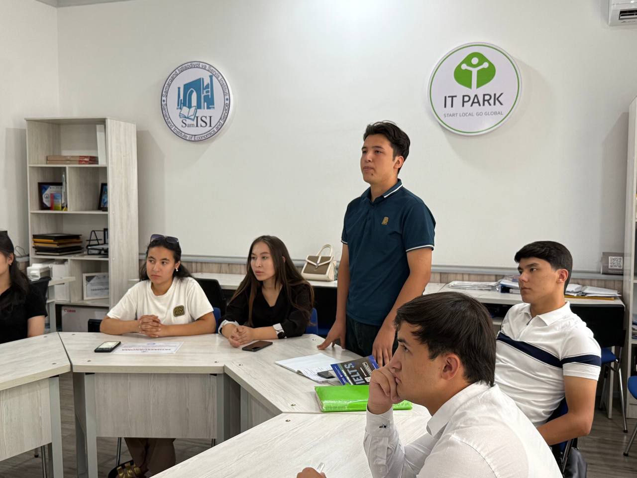 Uchrashuv davomida ilmiy-innovatsion ishlanmalarni tijoratlashtirish bo‘limi boshlig‘i Sh.Uralov tomonidan talabalarga to‘garak tashkil etish va uning asosiy maqsadlari batafsil tushuntirib berildi.