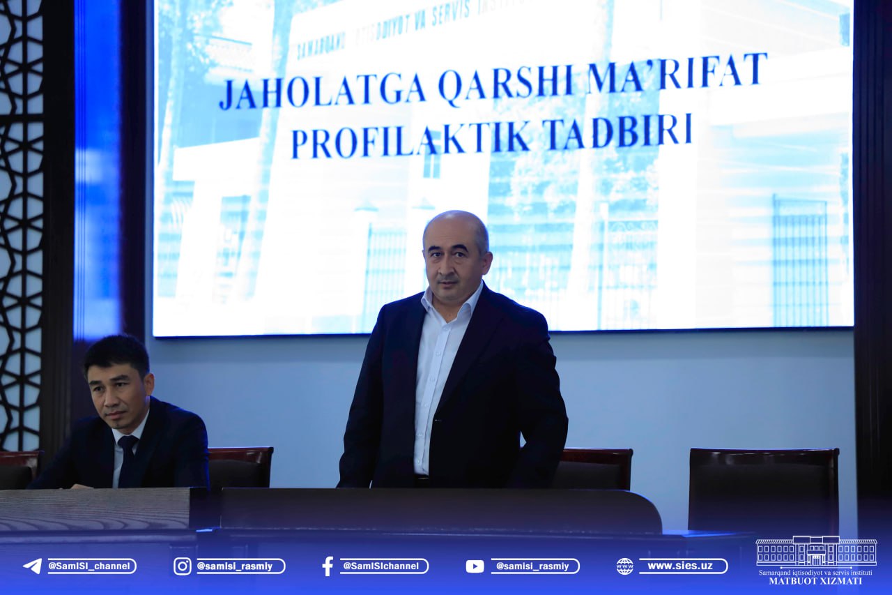 Samarqand iqtisodiyot va servis institutida professor-oʻqituvchilar hamda xodimlar ishtirokida "Jaholatga qarshi maʼrifat" profilaktik tadbiri boʻlib oʻtdi. Unda institut yoshlar masalalari, maʼnaviy-maʼrifiy ishlar boʻyicha birinchi prorektori A.Berdimurodov hamda oʻquv ishlari boʻyicha prorektori T.Sharipovlar tomonidan ishtirokchilarga mavzu yuzasidan tushuncha va tegishli yoʻnalishlar berildi. Xususan, hozirda jahonda yuz berayotgan siyosiy jarayonlar haqida ham soʻz borib, kelajak yosh avlodni tinchlikparvar, har tomonlama yetuk inson sifatida tarbiyalash institutdagi har bir xodim va pedagogikning vazifasi ekanligi taʼkidlandi.