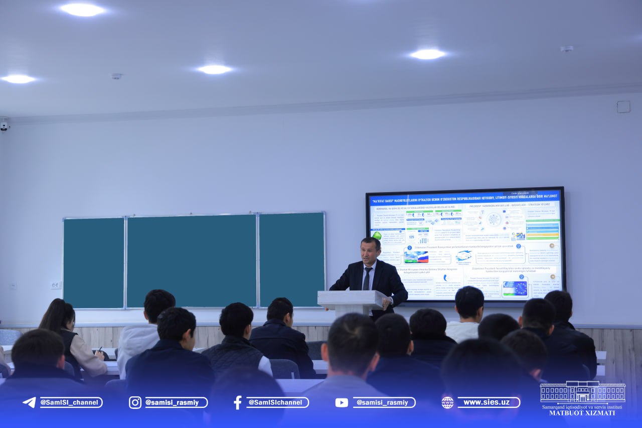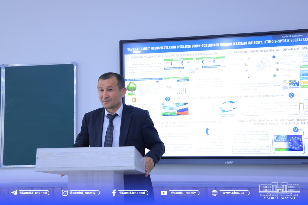 Samarqand iqtisodiyot va servis institutida talabalarni hozirgi kundagi siyosiy yangiliklar, yurtimizdagi iqtisodiy, ijtimoiy-siyosiy voqealardan xabardir qilish maqsadida "Ma'rifat darsi" mashg‘ulotlari olib borilmoqda. Xususan, buxgalteriya hisobi va menejment fakultetida fakultet dekani Jahongir Abiyev, iqtisodiyot fakultetida dekan o‘rinbosari Omon Sadikovlar tomonidan dars mashg‘ulotlari o‘tildi.