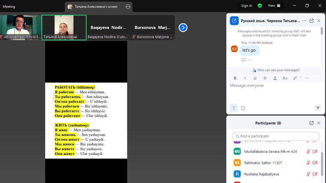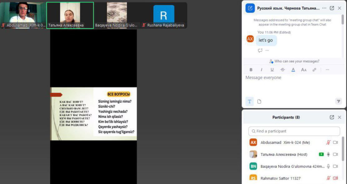 Mazkur mashg‘ulotlarda talabalar o‘z fikrlarini erkin ifoda etish, aniq va lo‘nda gapirish, adabiy tilda mulohaza yuritish kabi ko‘nikmalarni amaliy mashqlar orqali rivojlantirishmoqda. Darslar doirasida turli mavzular muhokama qilinib, ijodiy topshiriqlar bajarilmoqda.