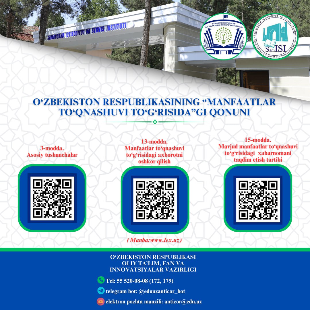 Agarda, Siz oliygohda manfaatlar to'qnashuvi, korrupsiyaviy holatlarga yo'l qo'ymoqchi bo'lgan xodimga duch kelsangiz maslahat so'rash yoki tegishli choralar ko'rilishi uchun darhol Samarqand iqtisodiyot va servis instituti korrupsiyaga qarshi kurashish "Komplayens-nazorat" tizimini boshqarish bo'limi xodimlariga aloqaga chiqishingiz soʻraladi.
