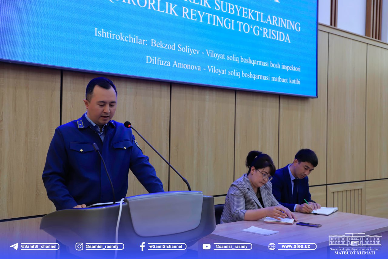 Samarqand iqtisodiyot va servis institutida talabalarning soliq sohasidagi bilimlarini oshirish, ularni tadbirkorlik faoliyati va soliq xizmati organlari o'rtasidagi hamkorlik aloqalari bilan yaqindan tanishtirish maqsadida "Tadbirkorlik subyektlarining barqarorlik reytingi" mavzusida mahorat darsi tashkil etildi.